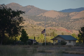 Ook hier bij het visitor center van John Day Fossil Beds NM hangt de vlag halfstok. Toen we in Seattle aankwamen hingen ook alle vlaggen aan overheidsgebouwen halfstok ter nagedachtenis van de neergeschoten agenten, daarna terug halfstok voor de slachtoffers in Nice, en nu weer voor neergeschoten agenten.